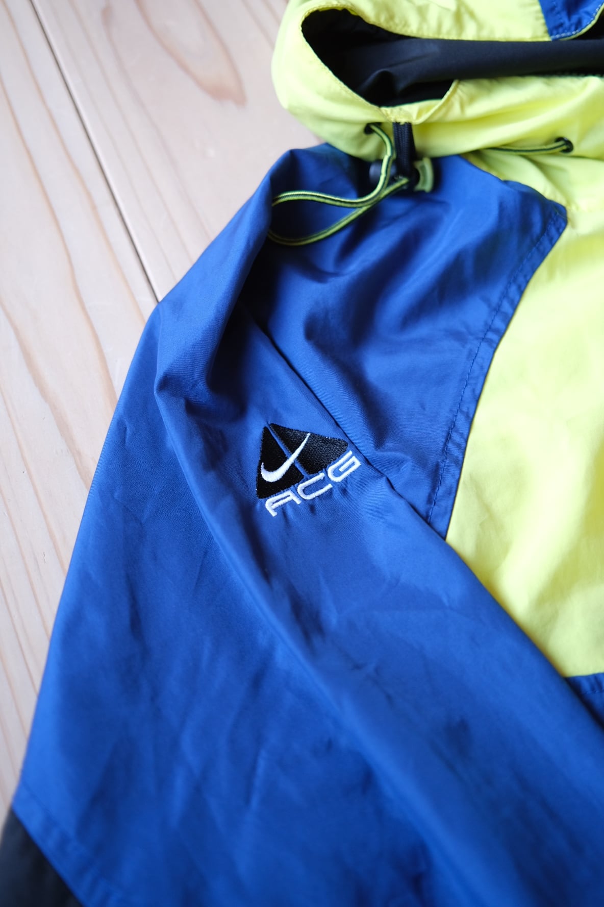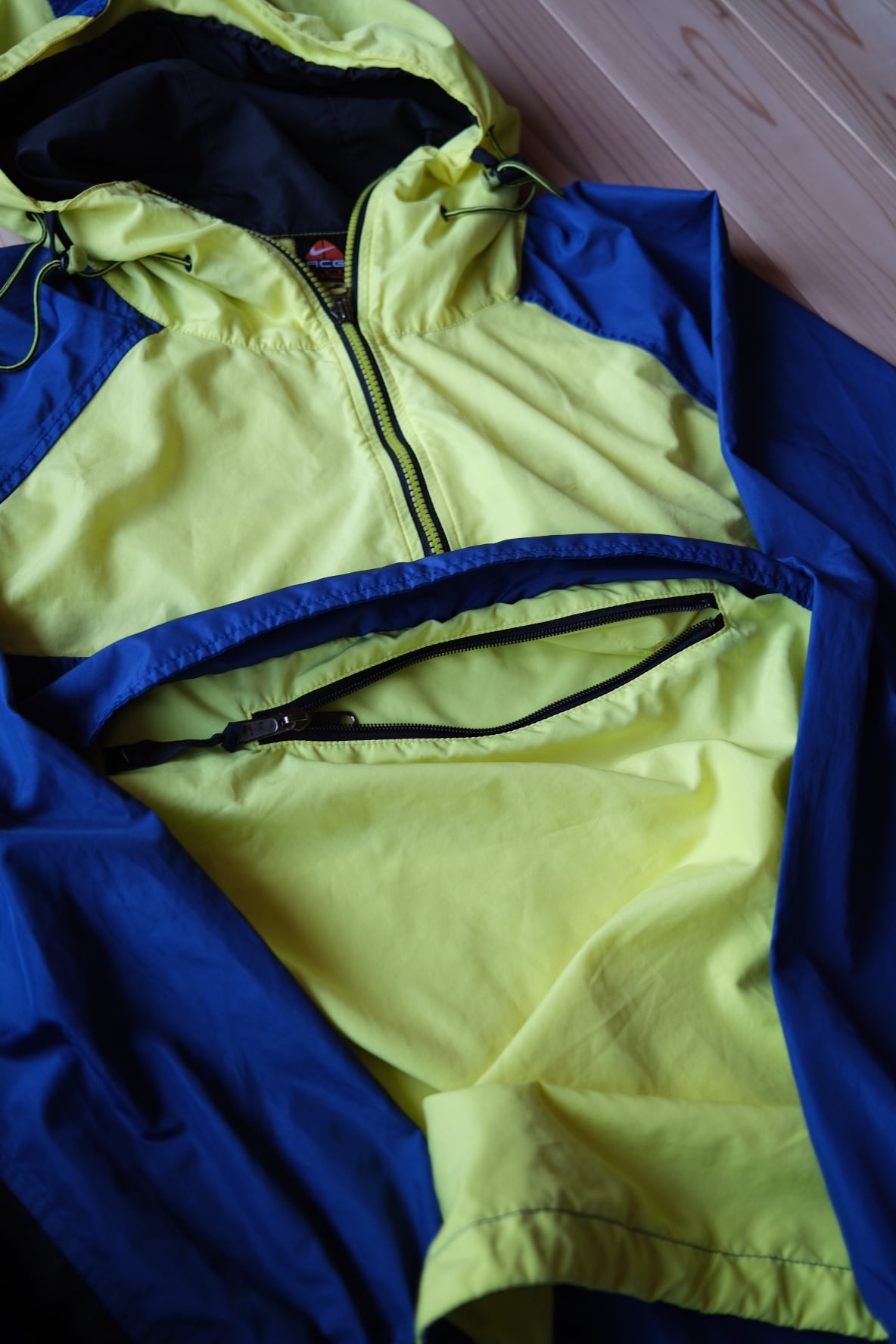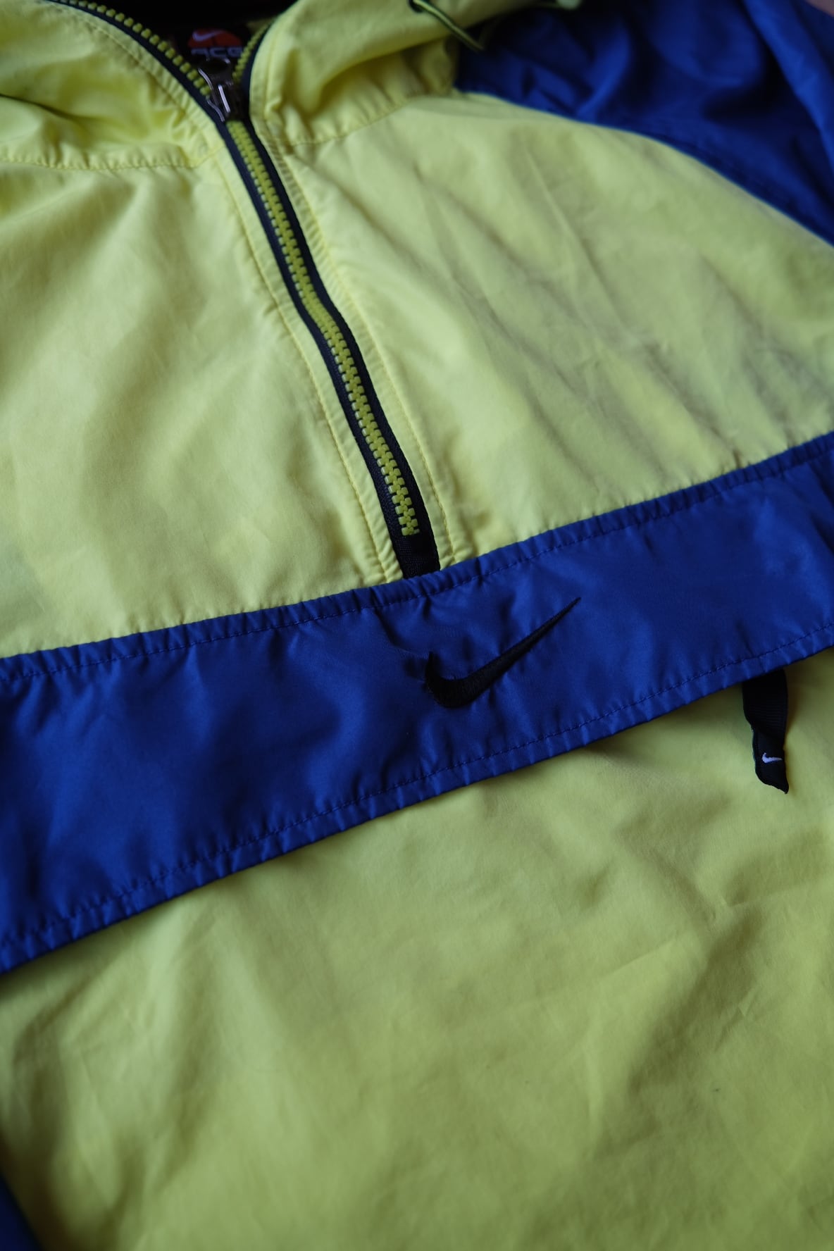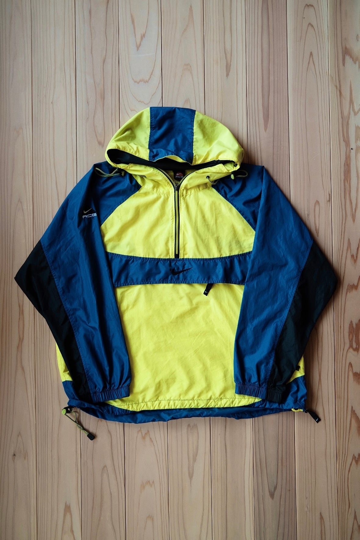 90年代のNIKE ACGを象徴する、鮮やかなイエロー×ブルーのカラーブロックが目を引くプルオーバーナイロンジャケット。