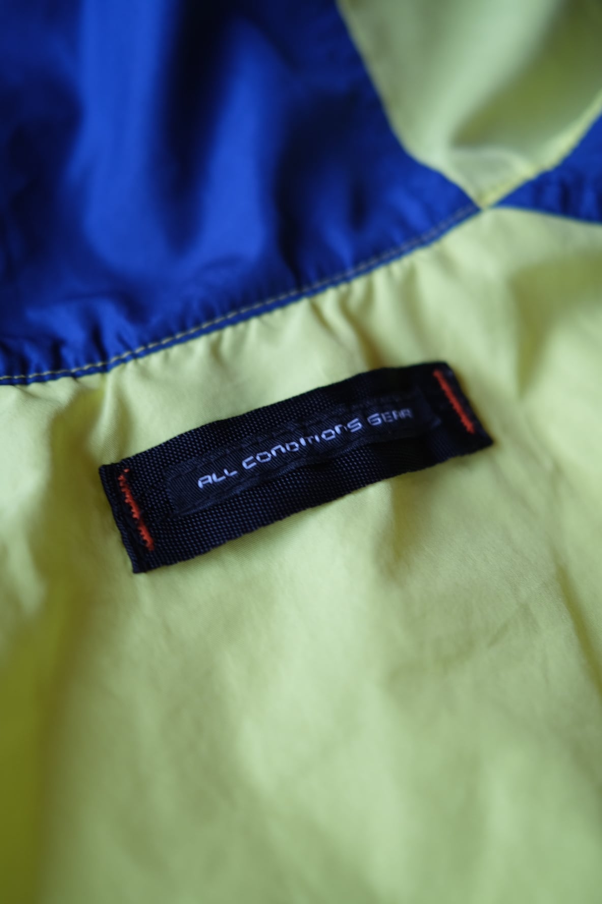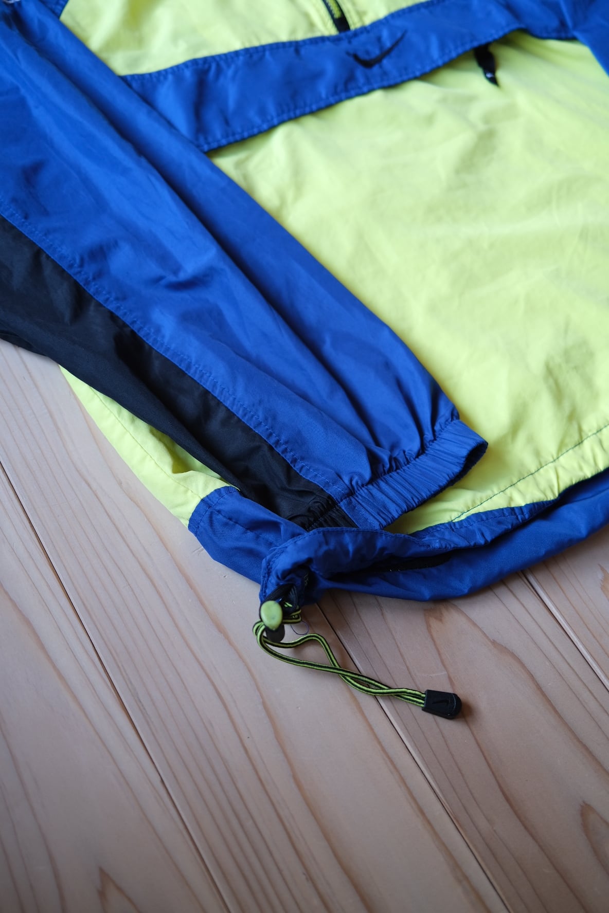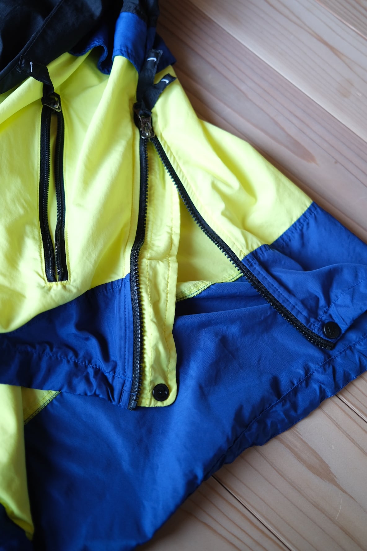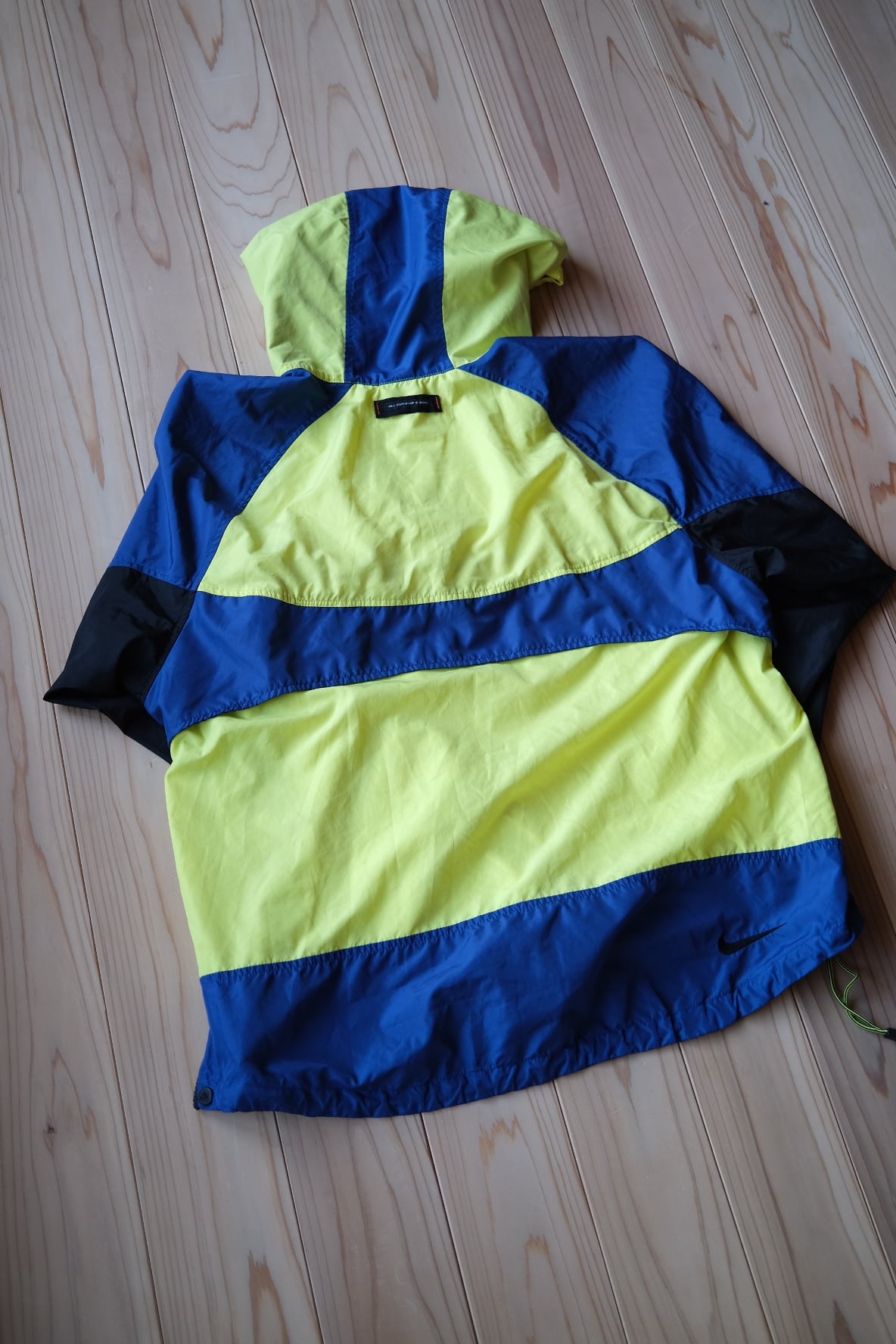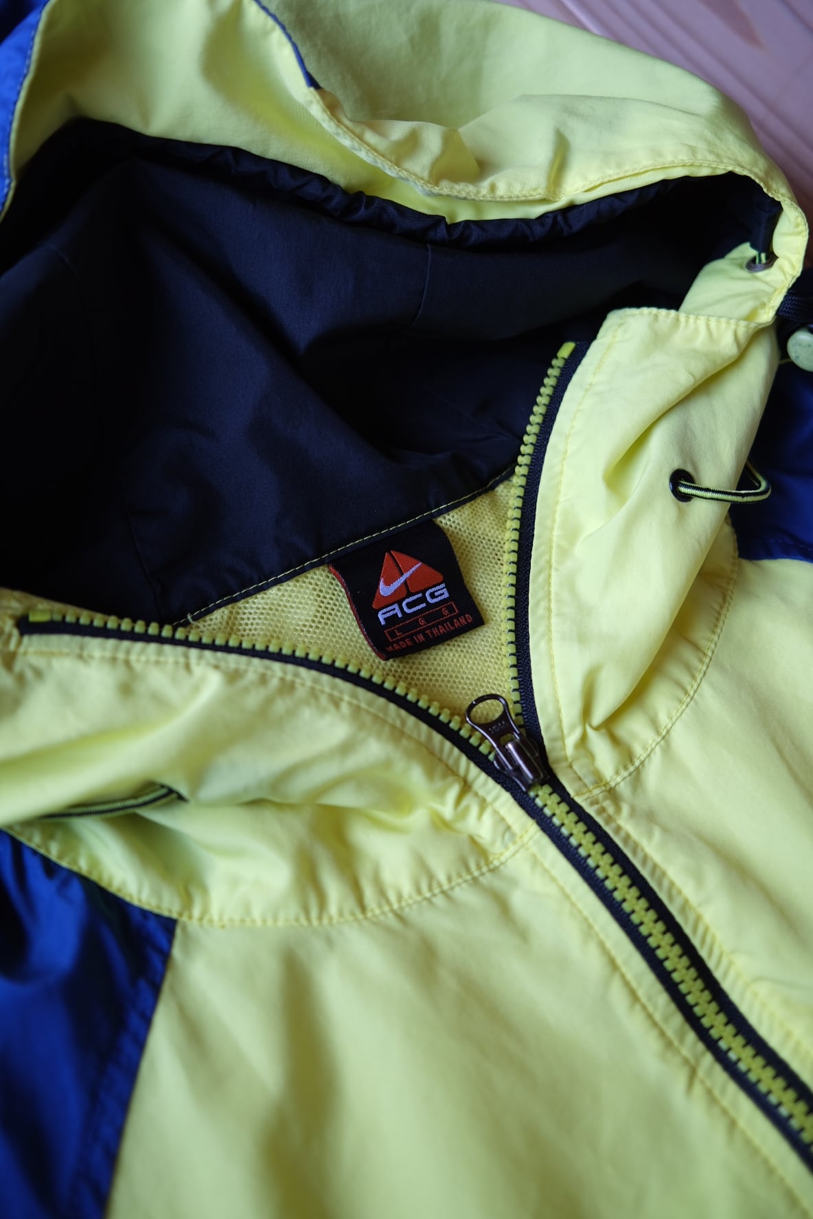 90年代のNIKE ACGを象徴する、鮮やかなイエロー×ブルーのカラーブロックが目を引くプルオーバーナイロンジャケット。