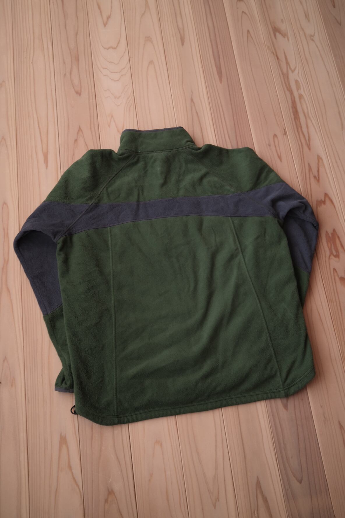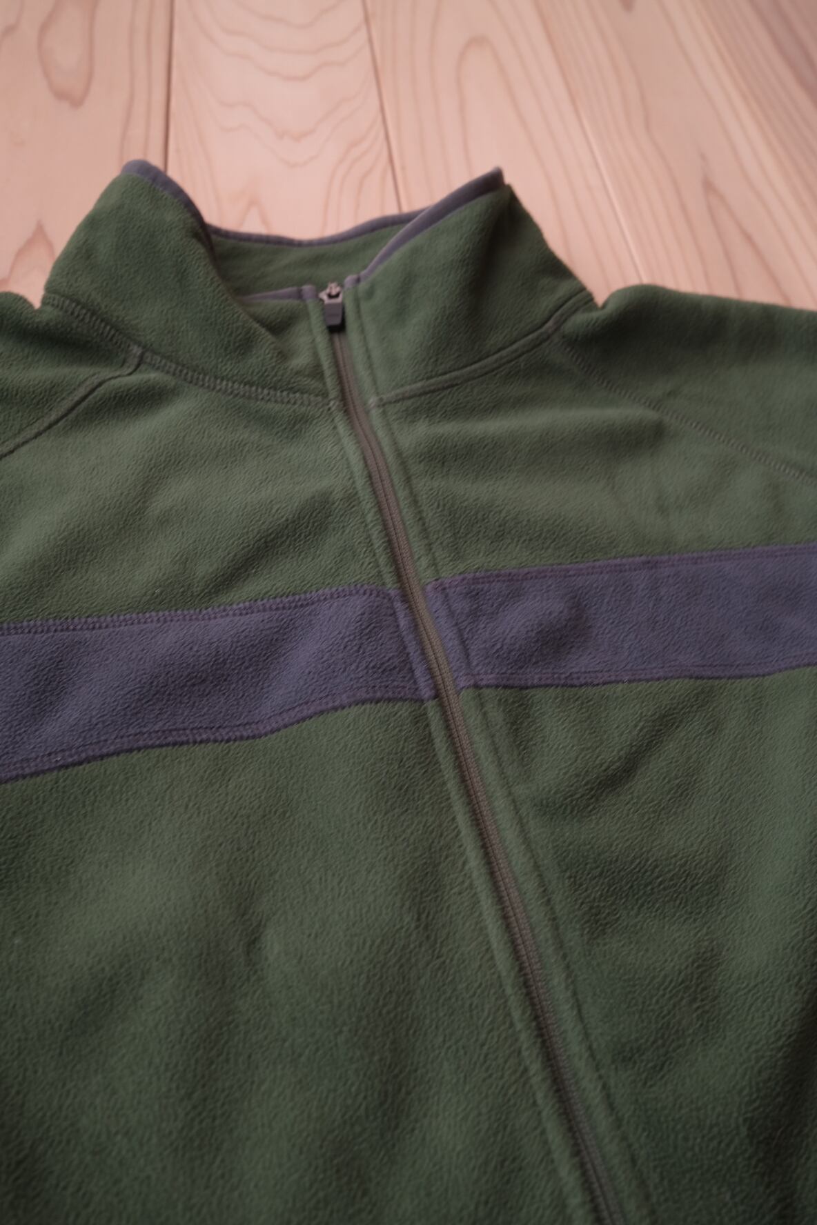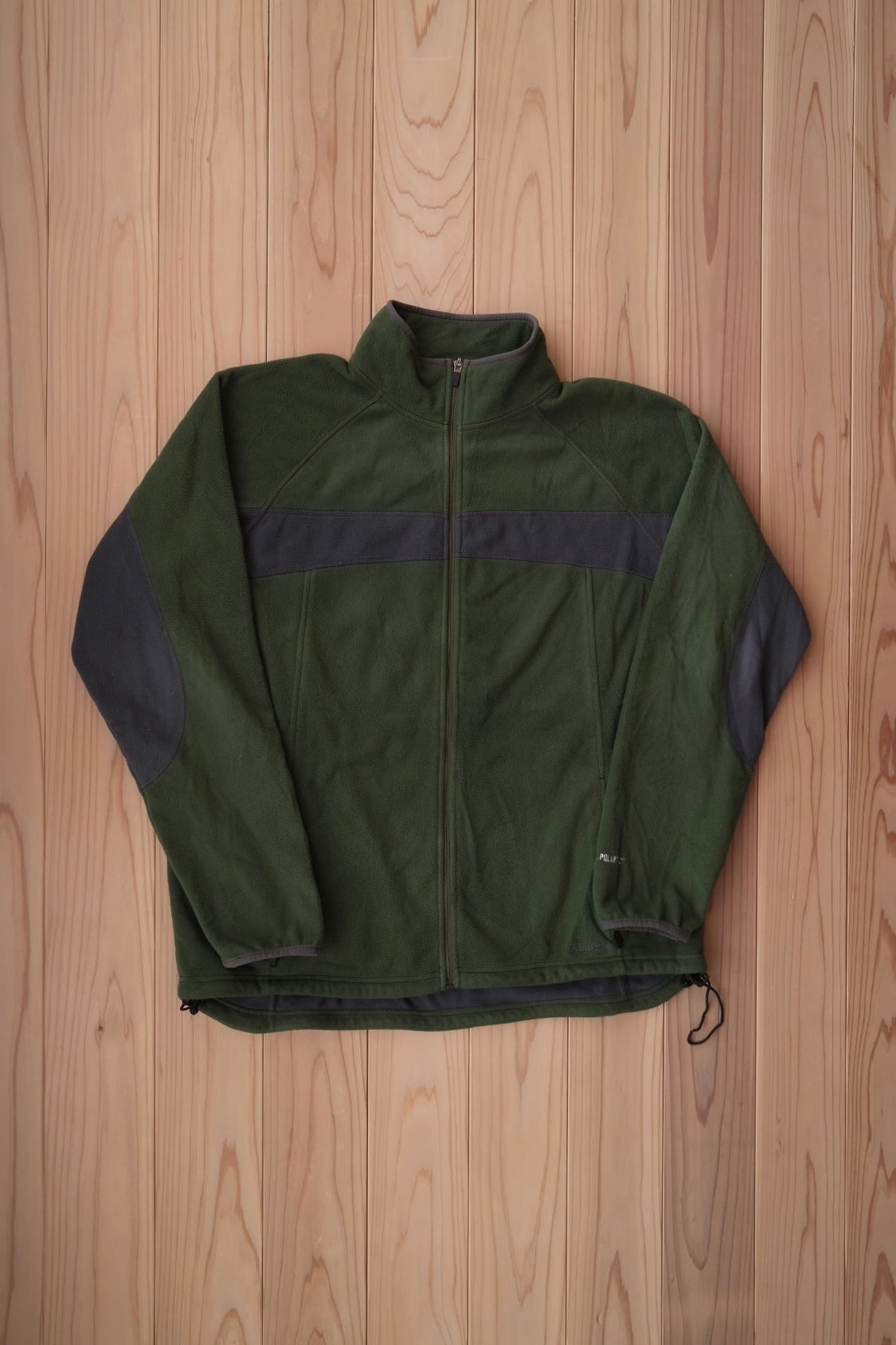 深いモスグリーンの色味がグッドなフリースジャケット。フロント〜バックに横断する切り返しも好みなディテール。安心安全な、polartecでございます。