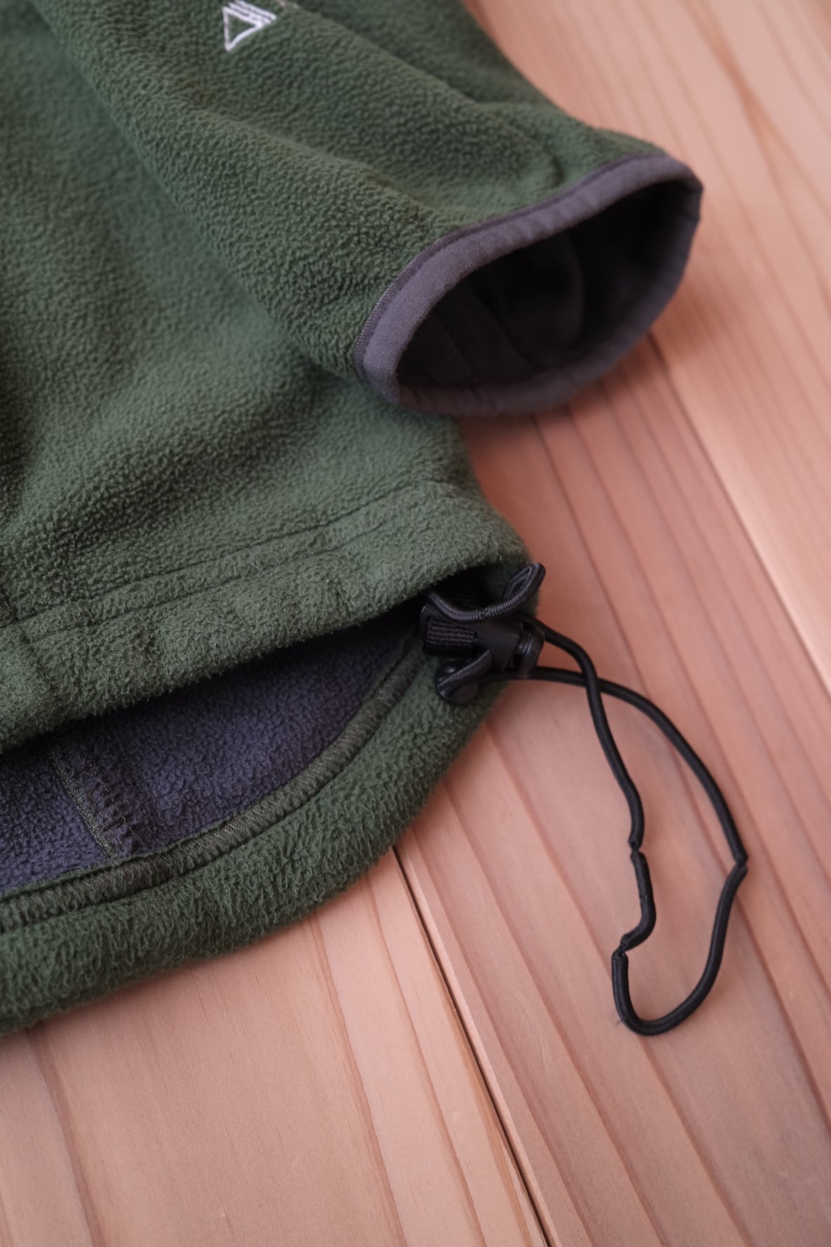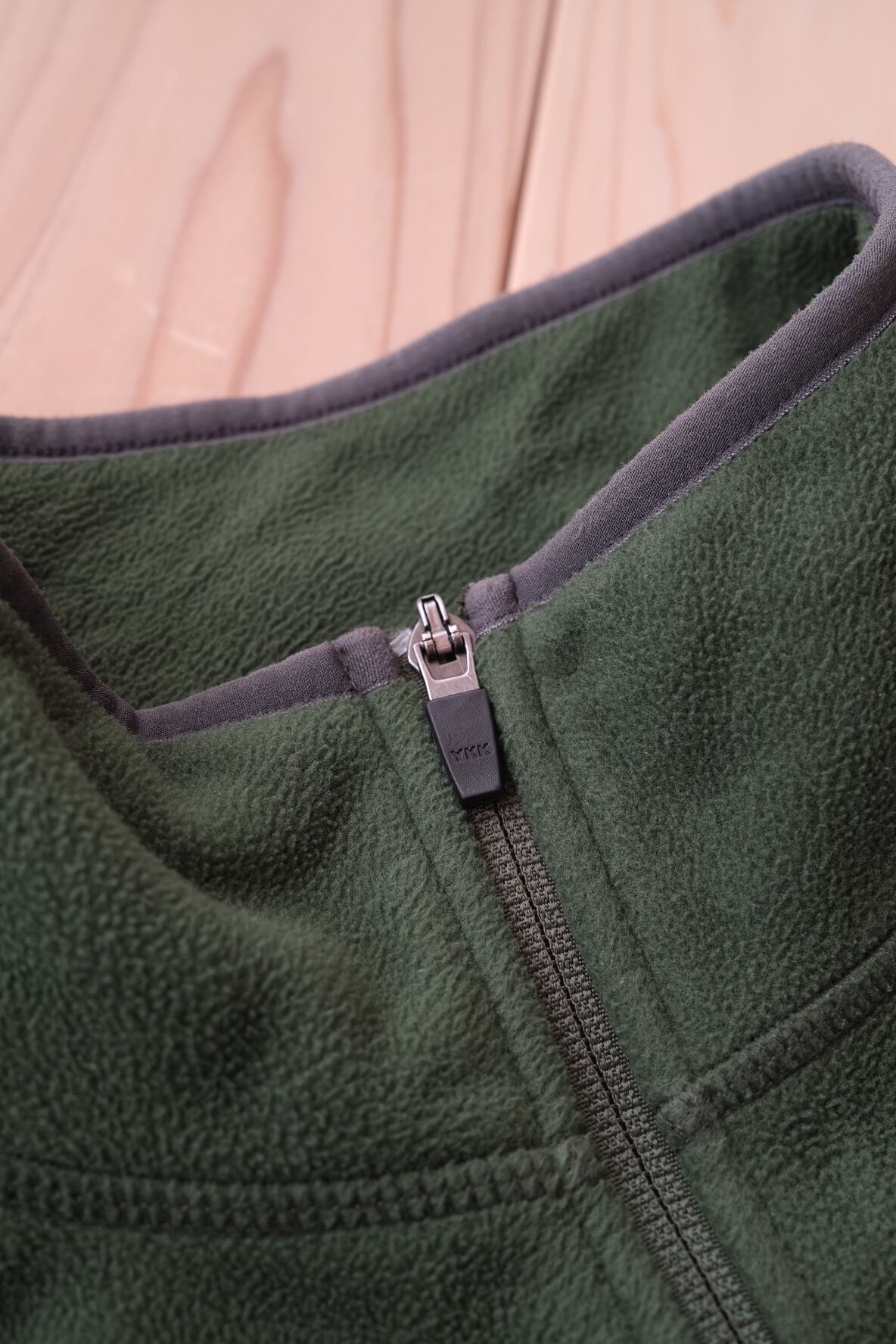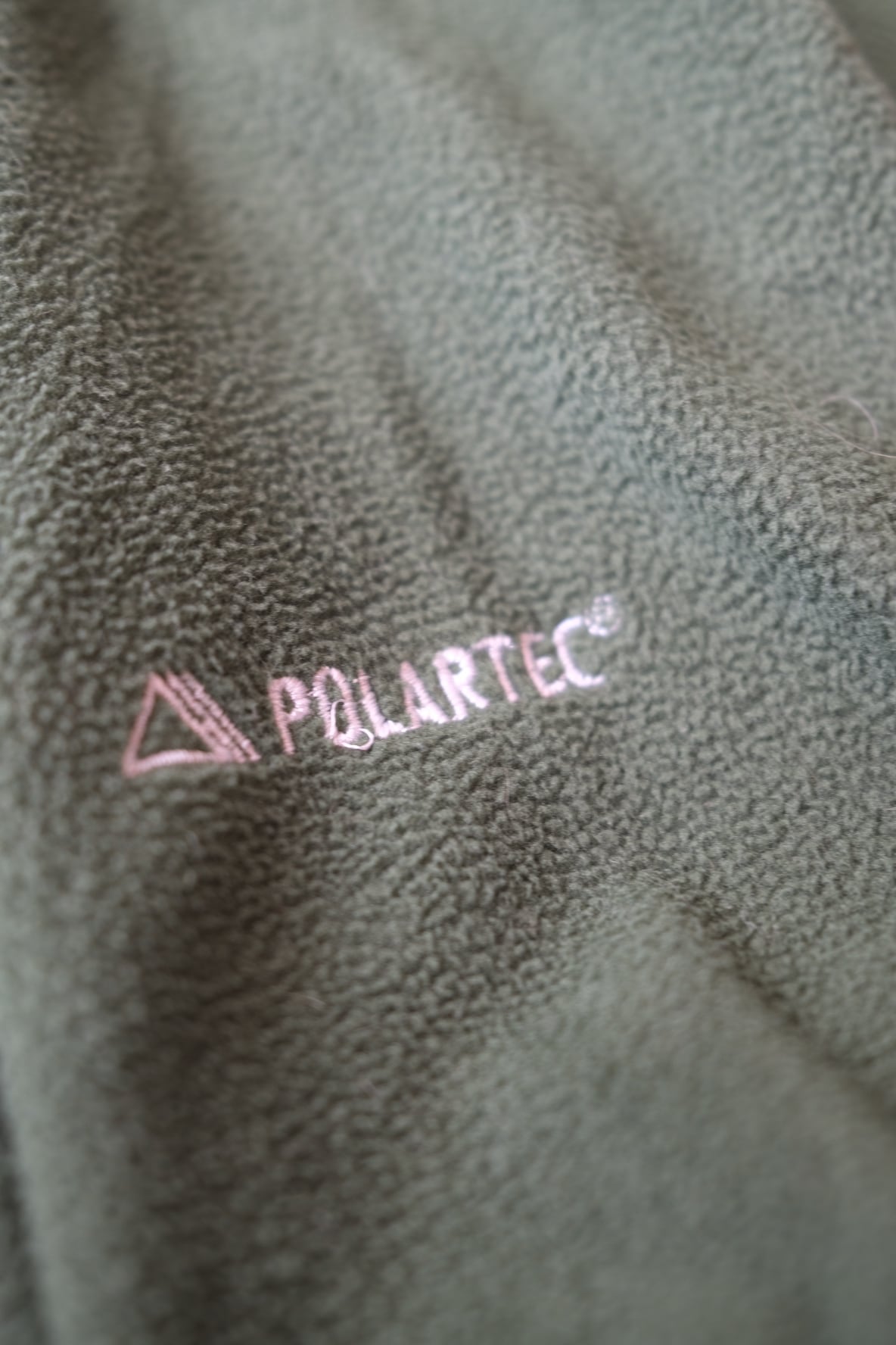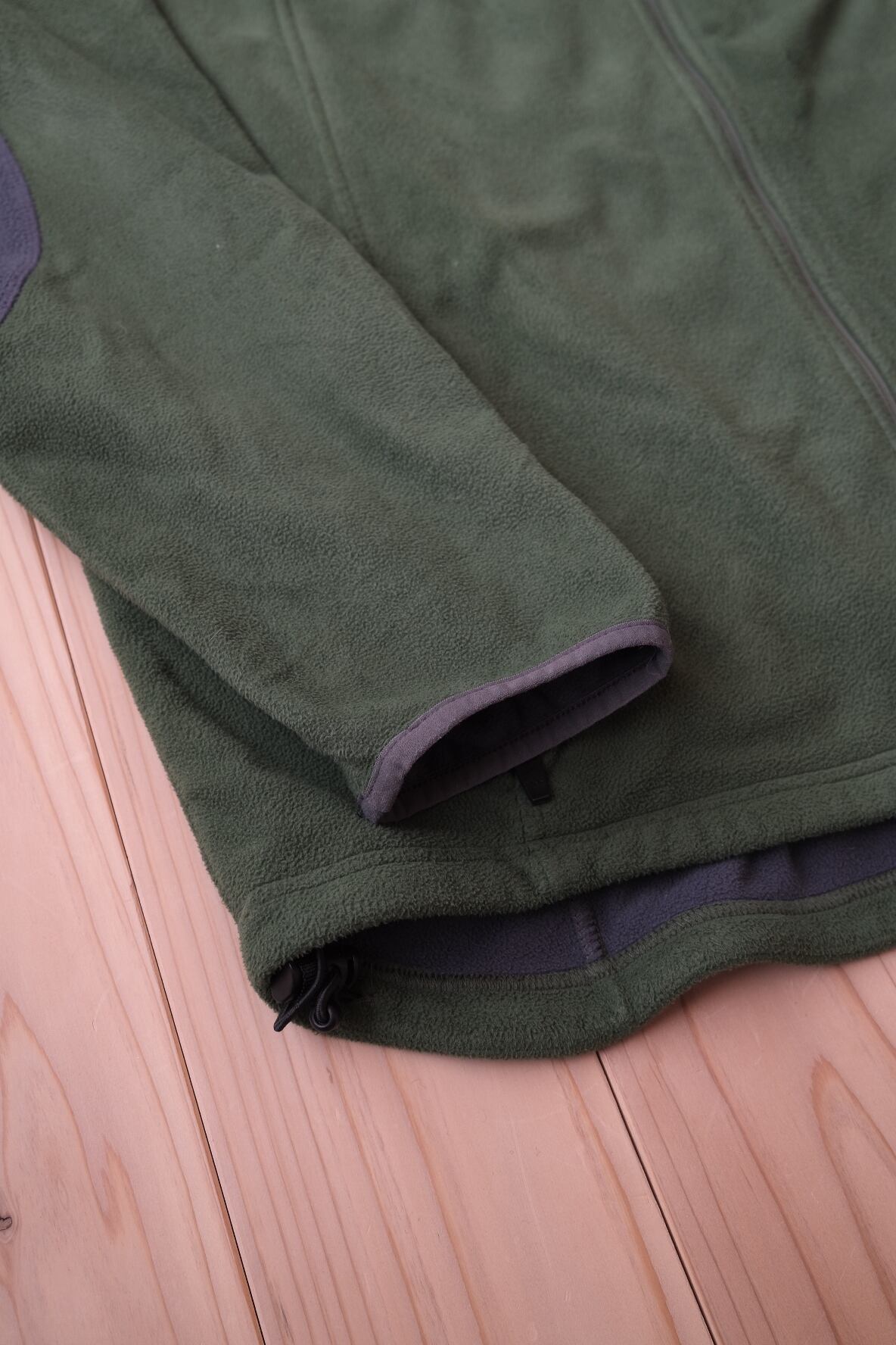 深いモスグリーンの色味がグッドなフリースジャケット。フロント〜バックに横断する切り返しも好みなディテール。安心安全な、polartecでございます。