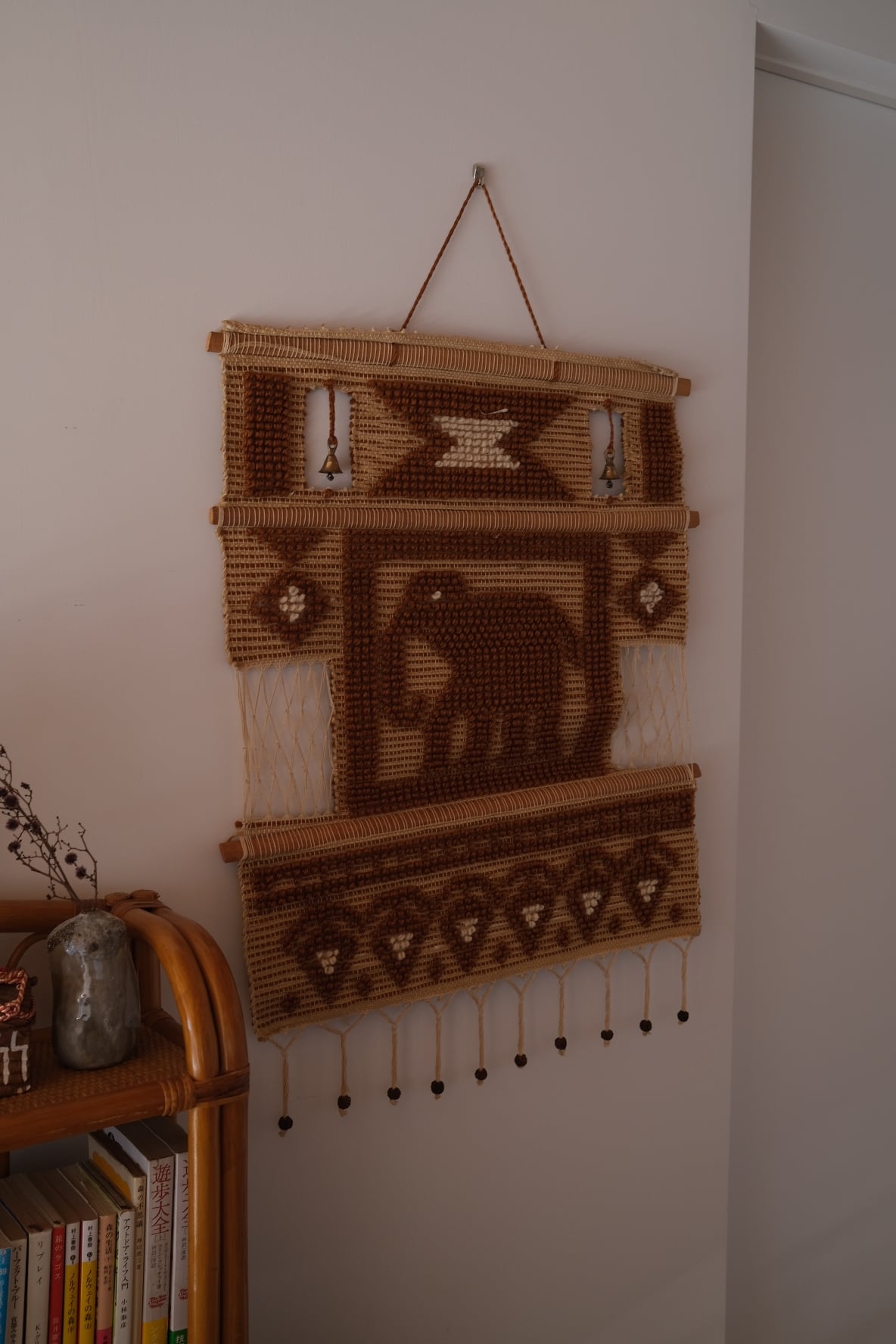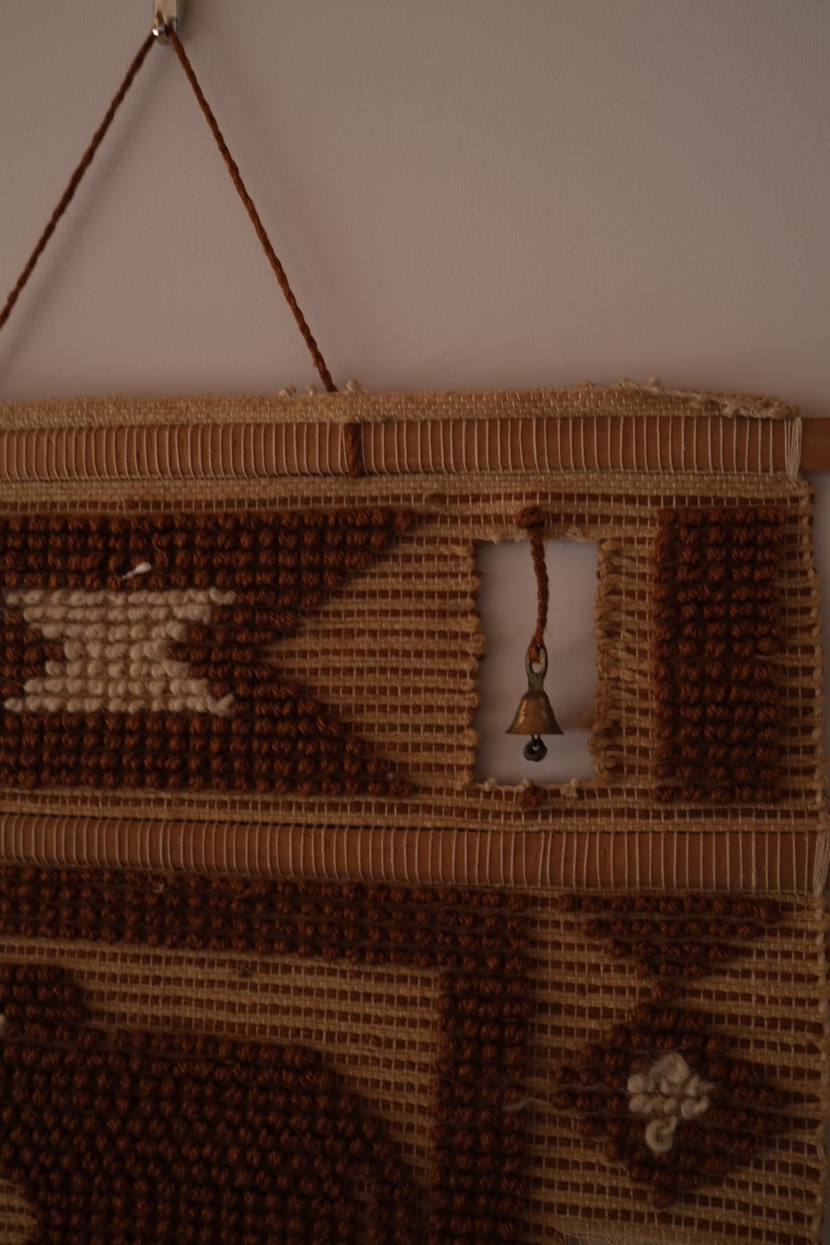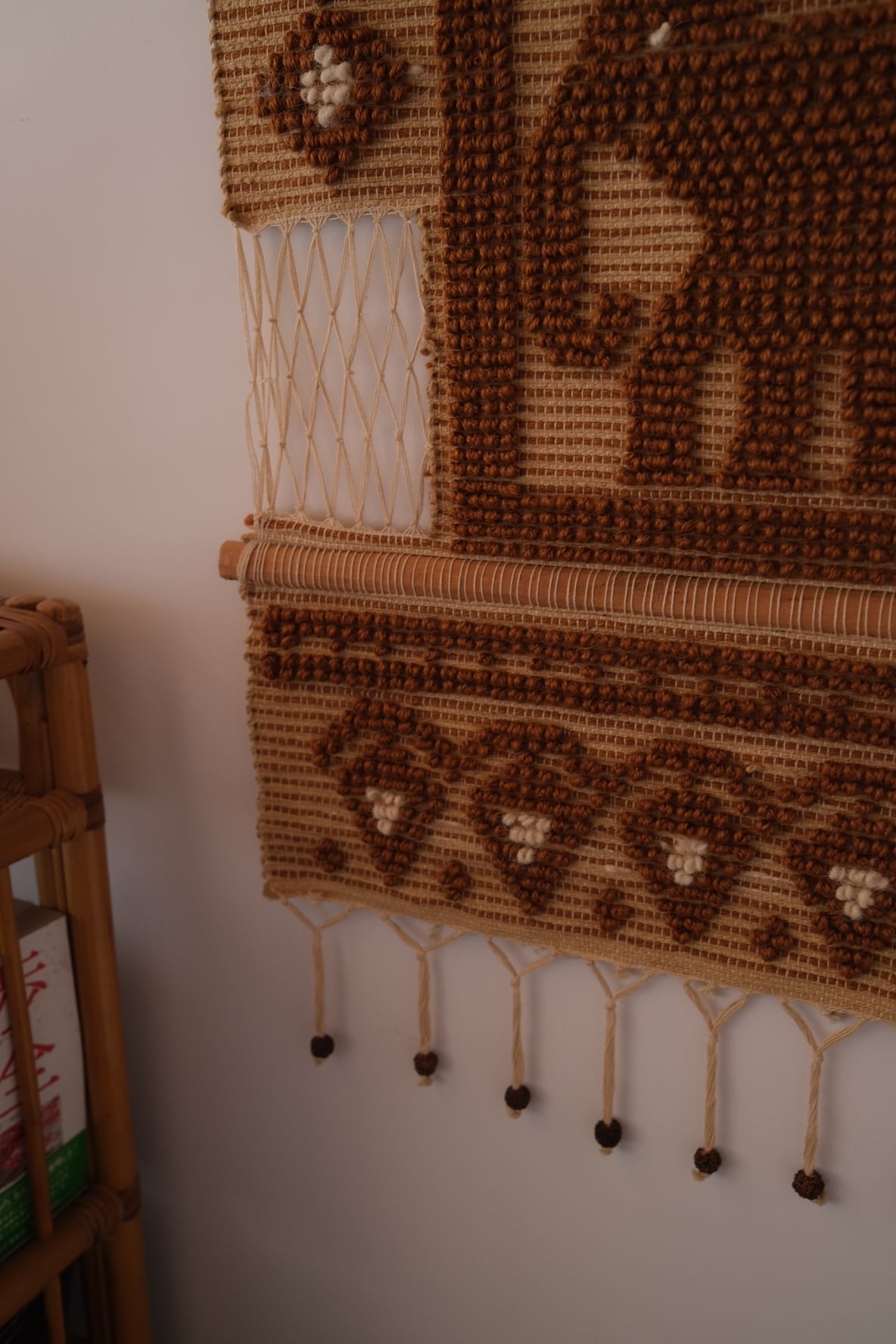 素朴なウール調の糸、均一ではない織りのリズム、木製バーとロープによる構成。