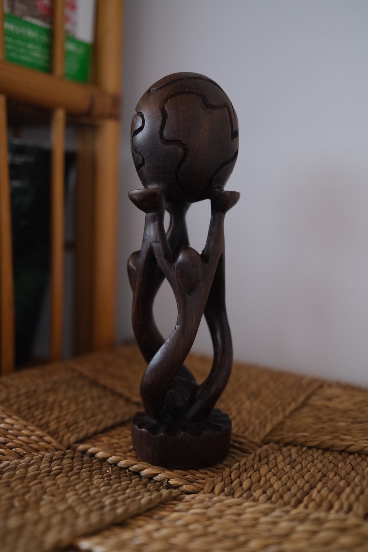 三人の人間が互いに支え合い、頭上の地球を掲げるように彫り上げられた木製スカルプチャー。