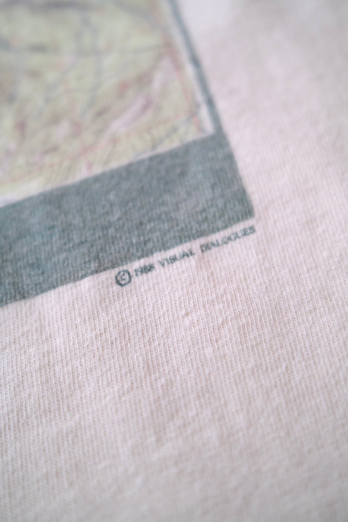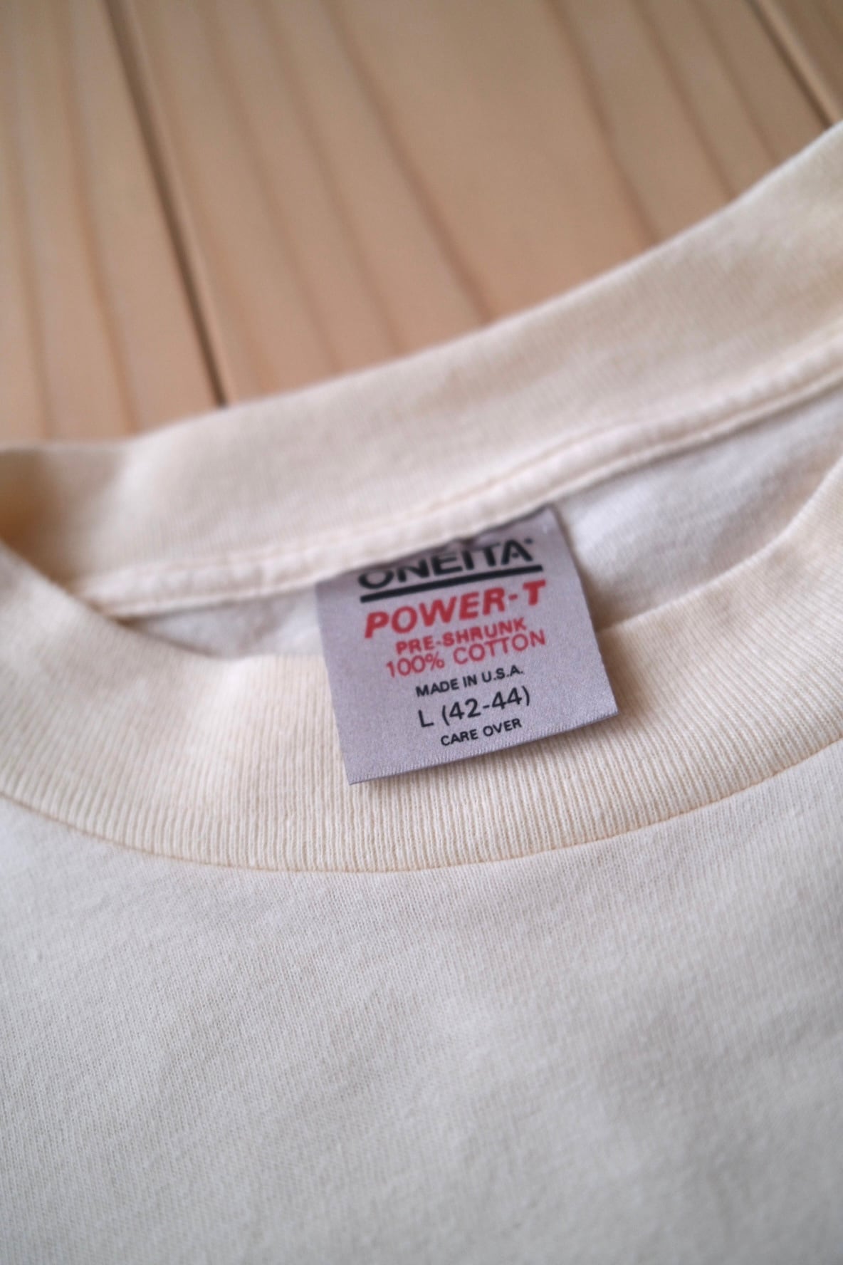 ボディは80年代らしい柔らかく馴染んだコットン。ナチュラルなオフホワイトに、やや褪せたグリーンのプリントがよく映え、今の気分にもハマる配色バランス。